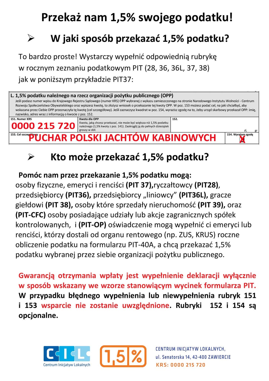 Aby przekazywane pieniądze dotarły do Nas należy podać nr KRS 0000 215 720 . wpisać cel szczegółowy Puchar Polski Jachtów Kabinowych oraz postawić x w kratce obok ( wyrażam zgodę ,to dla wiadomości kto przekazuje).